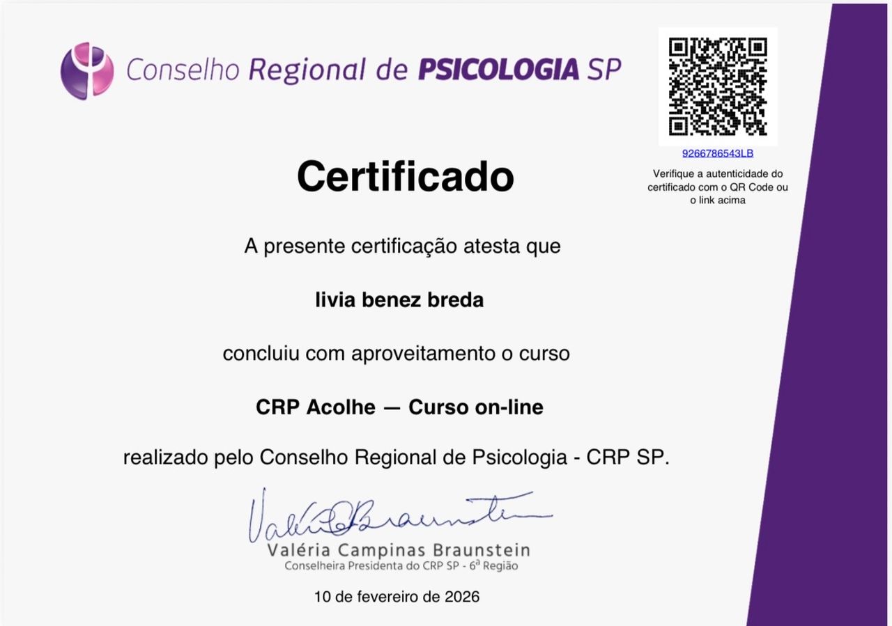 Sou psicóloga, com experiência em atendimento clínico voltado a adolescentes e adultos, atuando principalmente em demandas relacionadas à ansiedade, autoestima, relacionamentos interpessoais, regulação emocional e processos de tomada de decisão.
